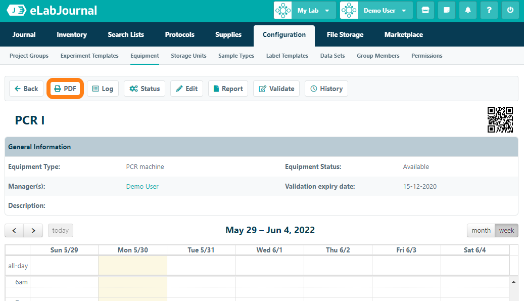 To exort equipment information from eLabJournal, you can export it as a PDF. Open the Equipment information sheet of the equipment you want to export and click on the PDF button.