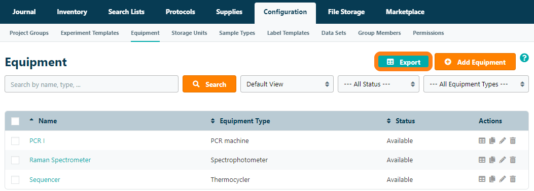 To export multiple pieces of equipment, you can create an export file in .xlsx format. Navigate to Equipment in Configuration and select the equipment you want to export. If you do not specify any equipment all equipment will be exported.