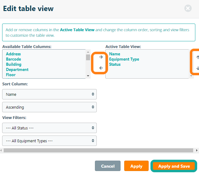 Once you have chosen your preferred displayed columns, click Apply or Apply and Save and the Equipment table will be displayed with the selected columns and chosen sorting order.
