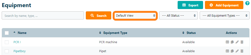 The displayed Equipment List displays the following default columns: Name Equipment Type Status and Actions. To customize the data of the displayed equipment you can customize the Default View.
