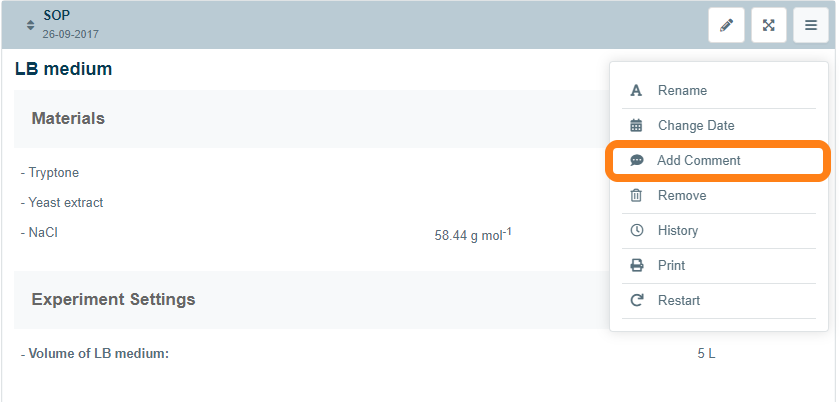 Besides adding a comment section in the ELN to make remarks on an experiment, you can also add comments next to any section of an experiment. Open the section context menu and select the Add Comment option.