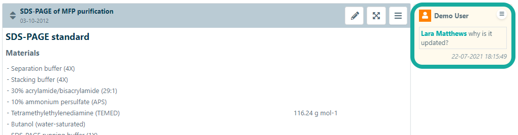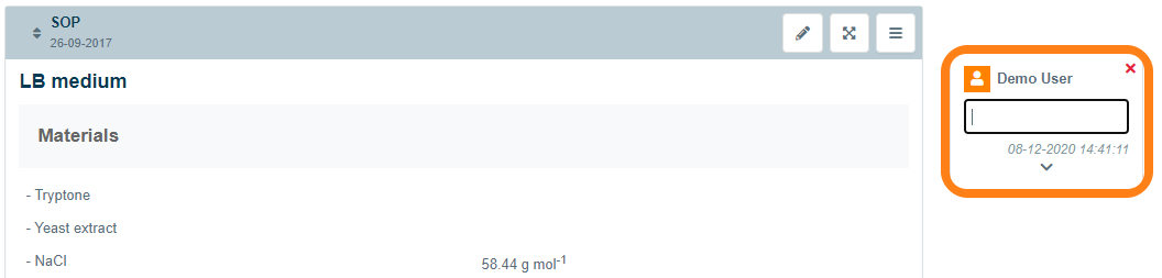 A comment will be placed next to the selected experiment section. Comments on an experiment section are intended to inform other lab members about changes or remarks during the progress of an experiment. As remarks are not part of the experiment data, they should be removed prior to signing the experiment. Any data in a comment that needs to be recorded in the completed experiment record should be added to a section.