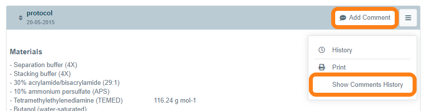 Comments can also be made on signed experiments. Use the Add Comment button to make a comment. You can view the history of removed comments by selecting Show Comments History in the section context menu.