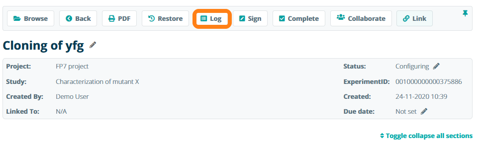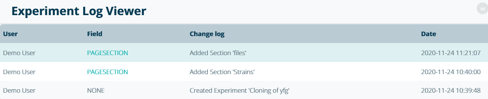 Note that in addition to tracking general changes in an experiment, changes to individual sections are logged in the section log.