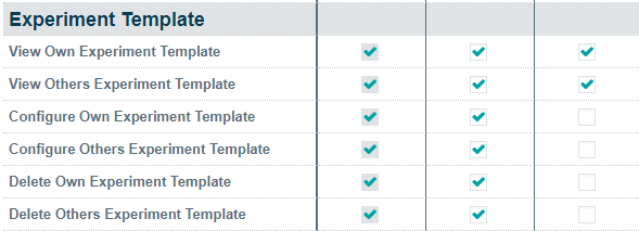 Navigate to Configuration – Permissions or to My Groups - Manage Permissions to change the rights of users to manage experiment templates. The following experiments permissions are supported: