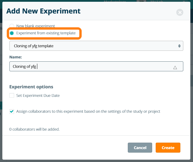 You can select the template from the dropdown menu. When the experiment is created, the template will be inserted into experiment to provide users with a predefined structure where they can efficiently document their data.