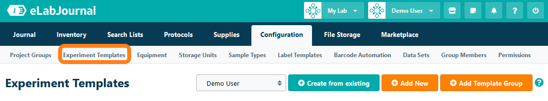 To add experiments based on a template with a predefined layout and/or data, you can set up an Experiment Template. Navigate to the Experiment Templates page under the Configuration tab.