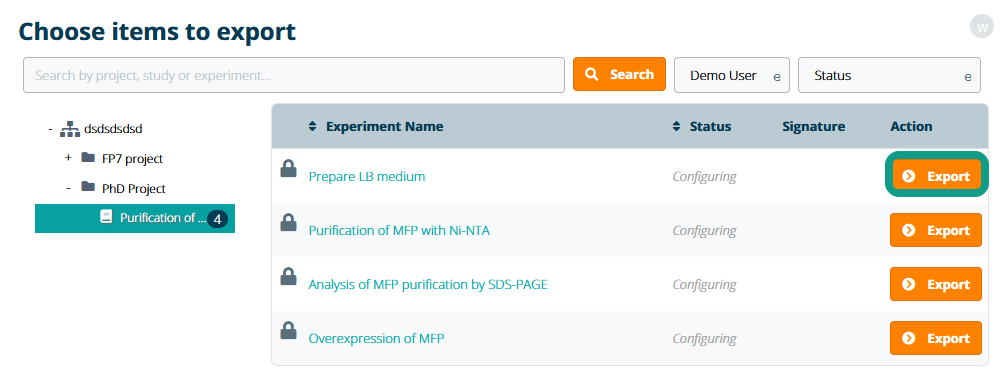 The experiment is added to the list of experiments to export. In this way you can add multiple experiments. Once you have added the experiments you want to export, you can click Start Export