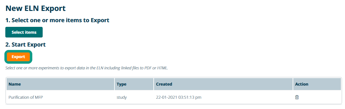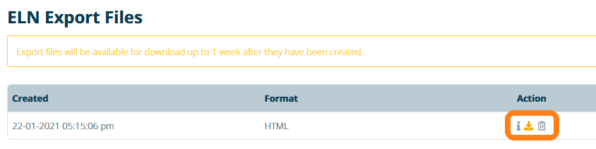 The generated export file will be added to the ELN export files list, from where you can download, remove or see the export file information.