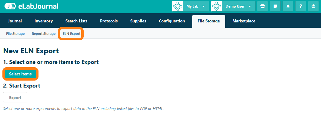 The ability to export data from eLabJournal is important for users who want to archive their data on a local server. eLabJournal supports several different options for exporingt experiments. You can export data in a PDF, HTML, JSON or XML format. For export of data in any custom format can be done using our API. To export data from your ELN, navigate to ELN export in the File Storage tab and click Select files to Export