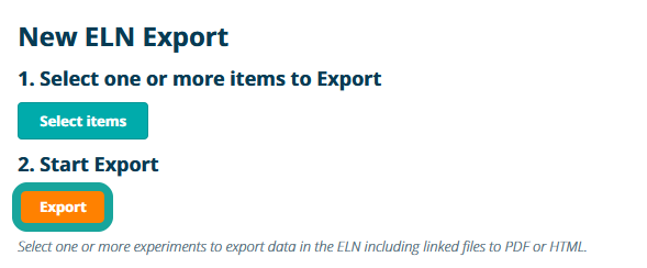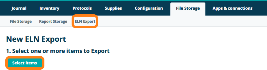 To export data from your ELN, navigate to ELN export in the File Storage tab and click Select files to Export
