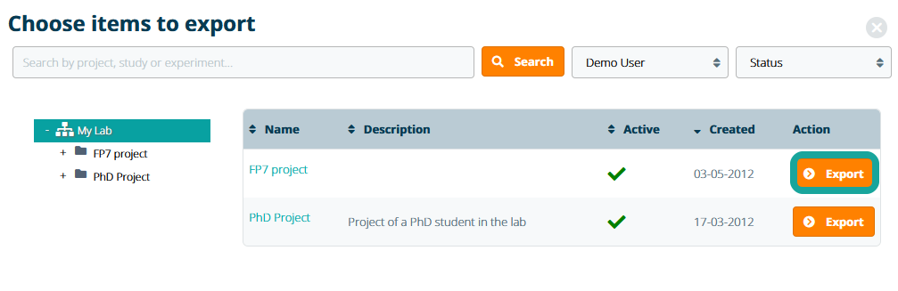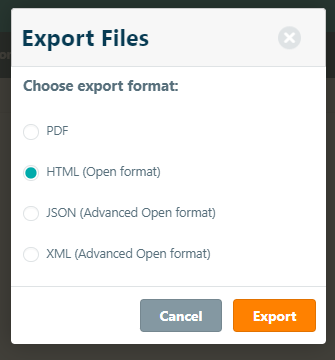 In the next step, you can choose to export the data as PDF, HTML, JSON or as XML file. Click on Export to start the export process. When exporting a project a ZIP file is created that contains all projects, including all contained studies and experiments in that project as well as all linked data files.