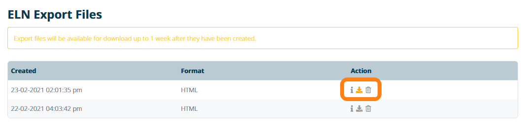 The generated export file will be added to the ELN export files list, from where you can download, remove or see the export file information.