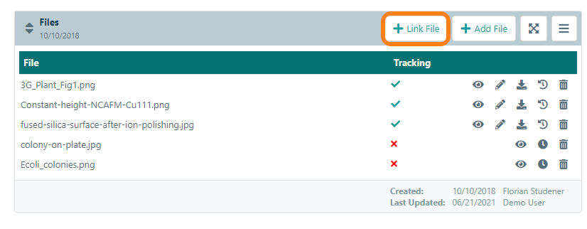 After installation of the External File Link add-on, the Link File button will become available in the ELN file sections.