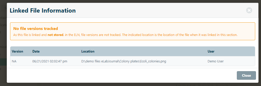Important notice: the use of this add-on breaks GLP compliance as files are not stored but linked from an external file location source in the ELN. Ensuring file integrity and versioning in accordance to GLP compliance should be handled outside of eLabJournal.