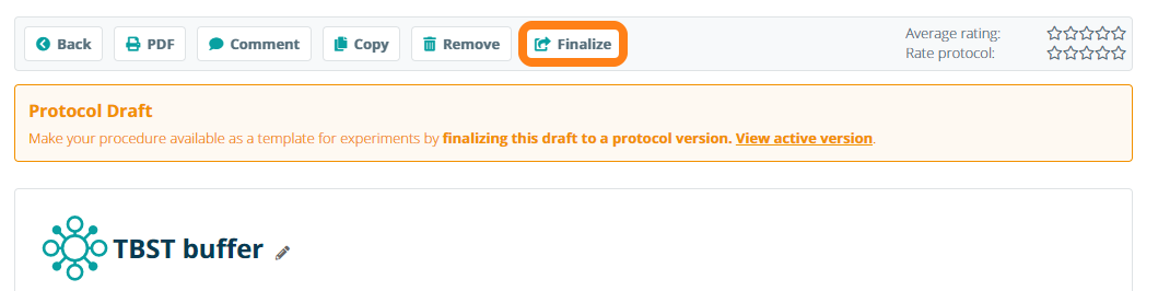To finalize an experiment, open the experiment draft and click the Finalize button in the toolbar. The finalized version of the protocol will be published as the active version and made available for lab members. Previously published versions are archived and can be viewed in the protocol's version history.