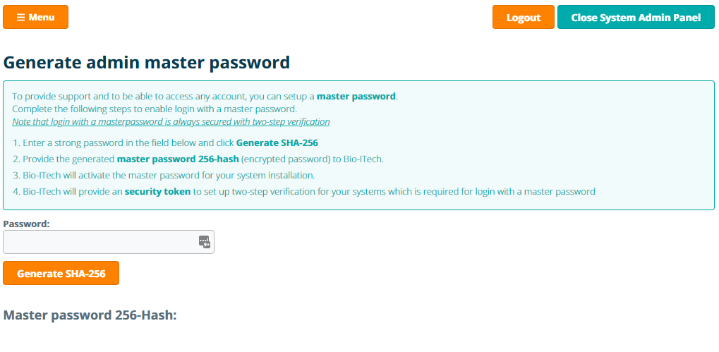 The generated SHA-256 key should be provided to Bio-ITech to be installed on the eLabJournal Private Cloud or On-Premise system installation. For security reasons, the master key login is protected with a mandatory 2-step verification. After providing the Bio-ITech with the generated SHA-256 hash of the chosen master key, Bio-ITech will provide the System Administrator with a security token to set-up 2-factor authentication (compatible with Google Authenticator, WithAuth or Protectimus Slim mini). The master key login for every account requires in addition to the entry of the master key, the additional entry of the 2-factor code.