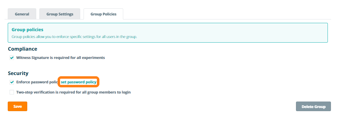 To ensure that all data in eLabJournal remains safe, the group administrator has the option to enforce a password policy that applies to all users in the group. Check the Enforce password policy option in the Group Policies tab under Group Settings. Note: for clients with Private Cloud or On-Premises installations, the option to set the group password policy may be deactivated for your group by the system administrator. Please contact your key user for more information.