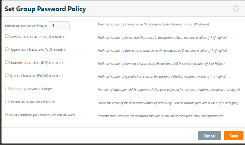 The following password policies can be set for each group.