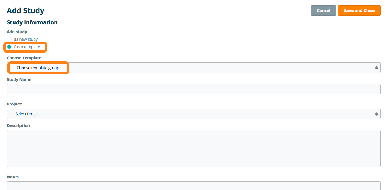 Once you have defined a study template, you can select the option to add a study from a template when creating a study. After selecting this option, you can choose the template from the revealed dropdown menu.
