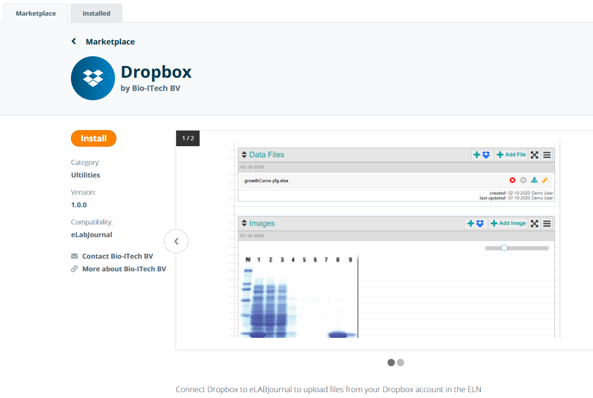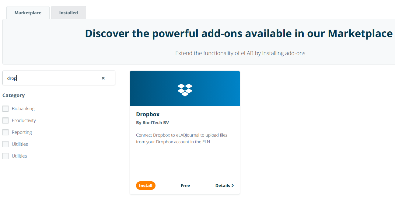To install an add-on, navigate to Marketplace and click on the add-on you want to install. Note that in the Marketplace, you can only install add-ons for user or groups. Installation of add-ons for all users in the system should be handled by the system administrator via the System Marketplace