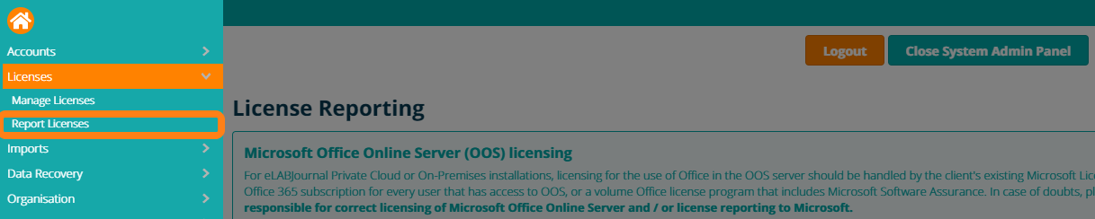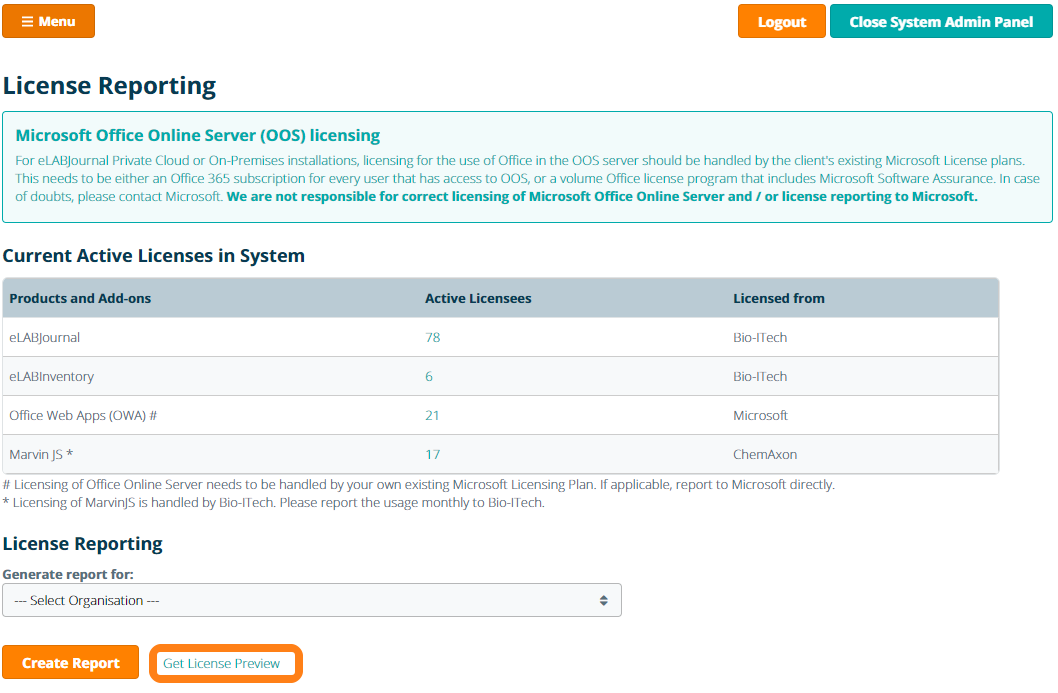 The license Reporting provides and overview of the number of issued licenses by active users within the system. eLabJournal Private Cloud and On-Premises licenses are typically issued with a fixed maximum number of active system users and are not required to be reported monthly, unless agreed otherwise. Note for use of optional third party add-ons including the Microsoft Office Online Server (OOS) and the Chemaxon MarvinJS add-on, licenses are handled separately. The reporting of licensing of OOS should be handled with Microsoft directly (find more information here), while the reporting of MarvinJS should be done monthly to Bio-ITech (Bio-ITech will report to ChemAxion).