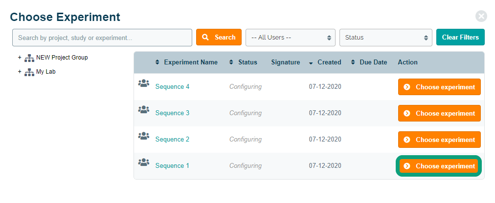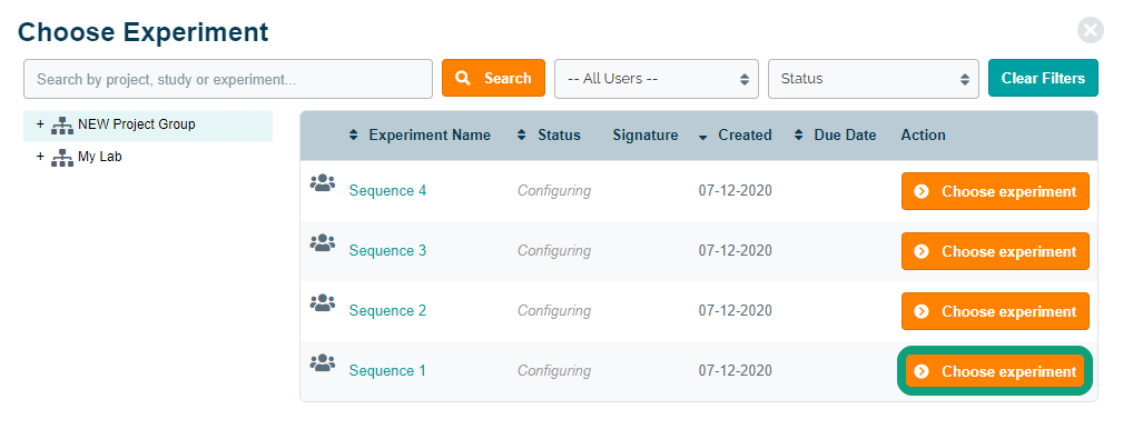 Next, you can browse through your projects and studies to find the experiment you want to link. Click Choose Experiment to insert the link for the selected experiment into your text section.