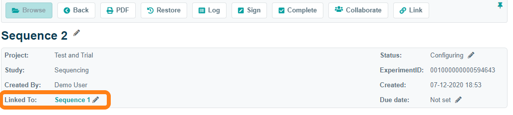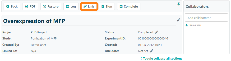 In the ELN, there are two options for linking experiments to one another. Users can either link an experiment at the section level, or link an experiment at the experiment level.