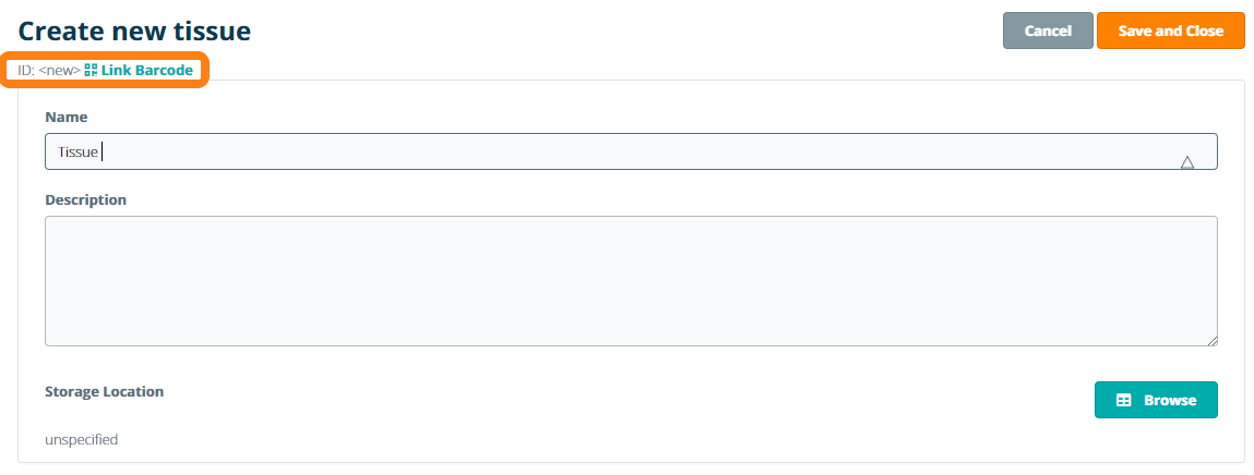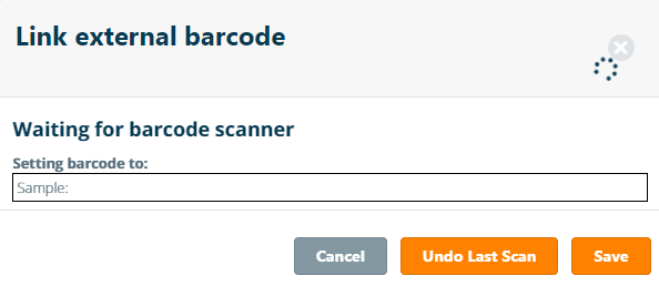 Scan the external barcode of the sample you want to store into the pop-up window. After scanning the barcode, click Save to link the external barcode to the sample record.