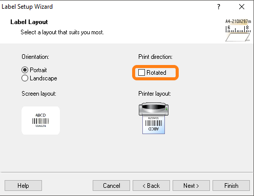 In the Label Layout uncheck the checkbox Rotated, this is so you have a good preview in eLabJournal, if your preview in eLabJournal is upside down it is because of this setting.