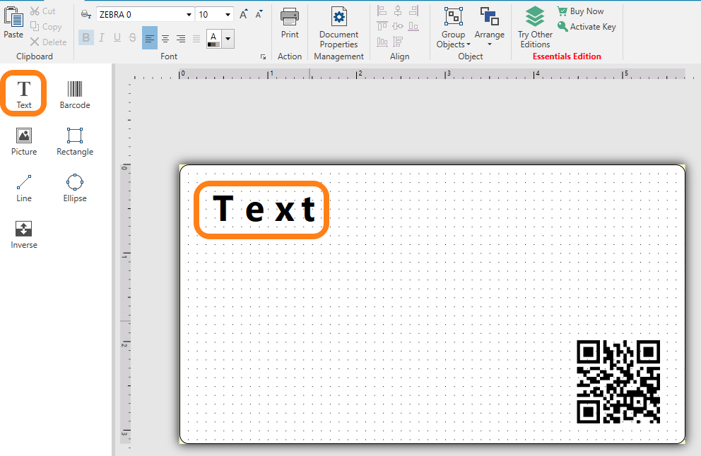 scanner to read). To add sample information (e.g. sample name, type, etc.) to your label, add a text field. Click on Text and click on your label. The Text will be added.