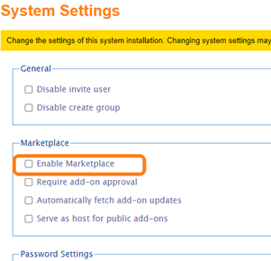 To enable Marketplace for your system go to the System Settings in the System Admin Panel and check the Checkbox Enable Marketplace