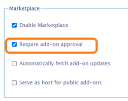 To select what add-ons are visible in Marketplace check the Require add-on Approval checkbox. Add-ons retrieved from our public repository require approval by the key-user to allow installation in the system.