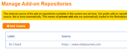 Go to Add-on repository Source in Marketplace and add https://www.elabjournal.com as an external add-on repository to retrieve any new public add-ons and add-on updates.