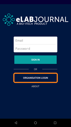 After downloading and installing the eLabJournal App from the Google Play store or Apple App store, enter your registered (organisation) email address and password and press Sign in. In case your or organisation uses AD/LDAP/Single-Sign-On you must log in using the Organisation Login.