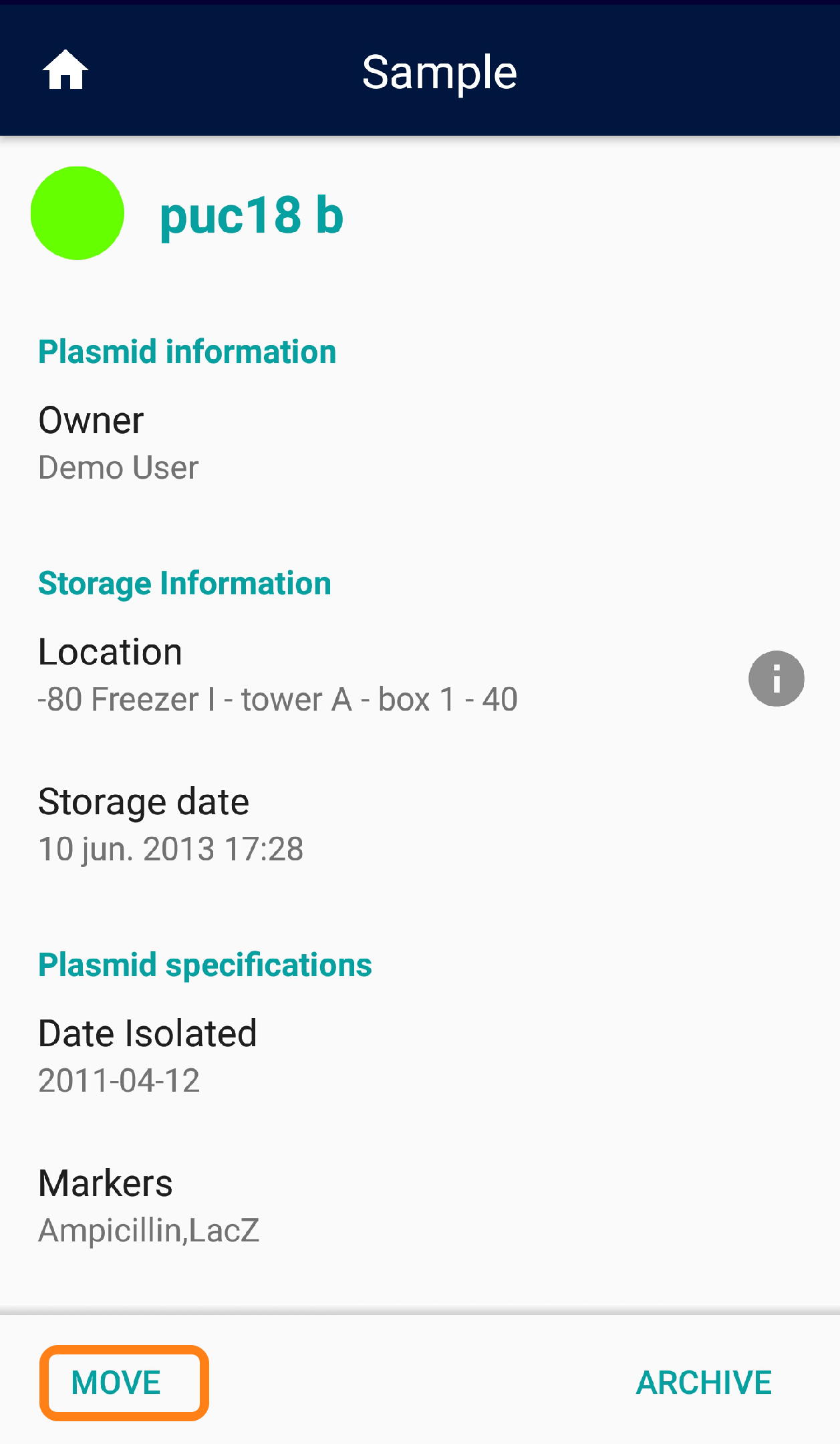 With the Mobile App you can move samples. After scanning a sample barcode, press the Move option.
