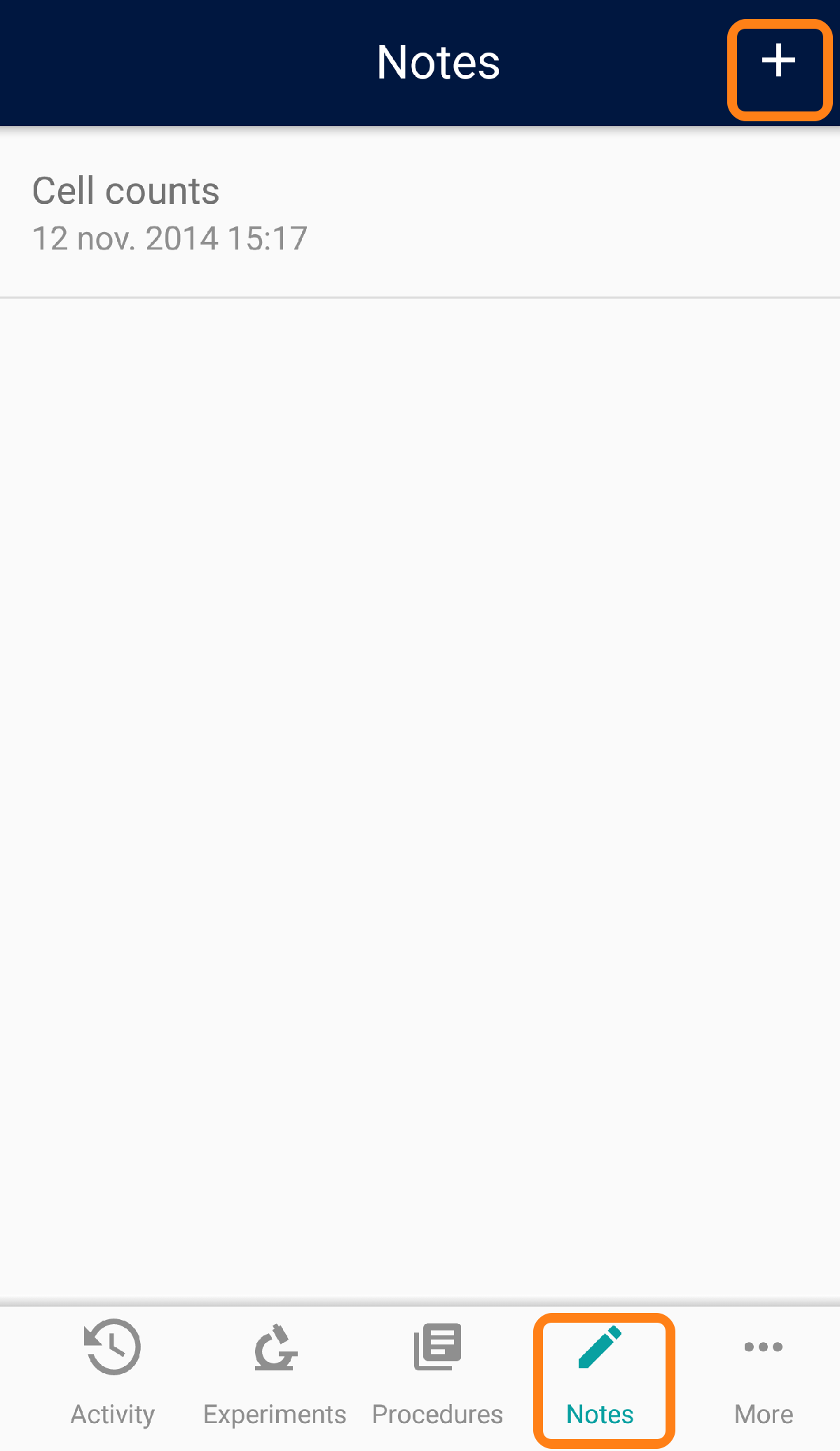 With the Mobile App you can make notes to sync them to the web application. Created notes can from there be added to an experiment. Open the Notes tab and click on the + icon. Note that on iOS, the option to add notes can be found under more.