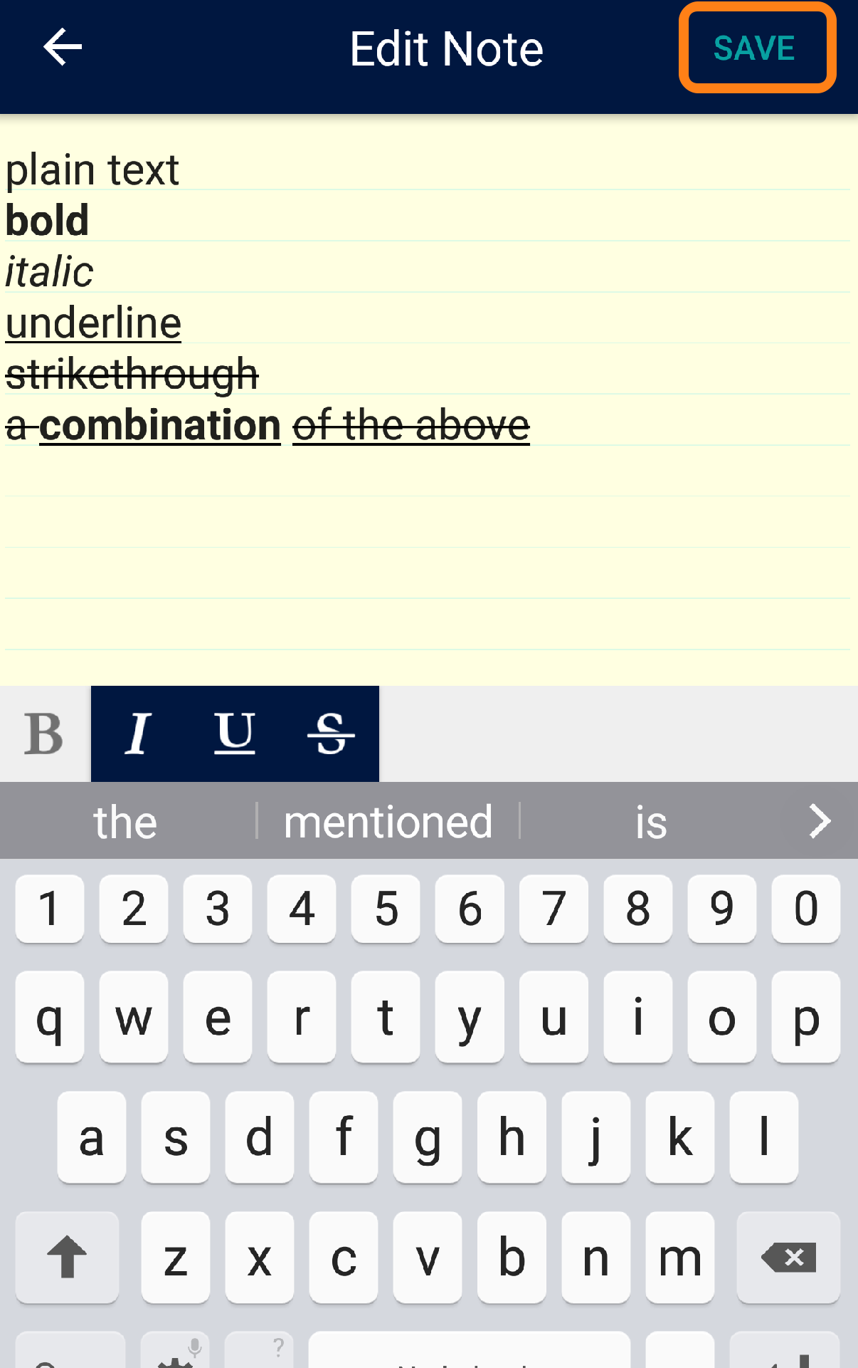 Enter the note and use basic formatting to set the styling of the note content. Click Save to store the note. The first line of the note will automatically be set as the title of the note.