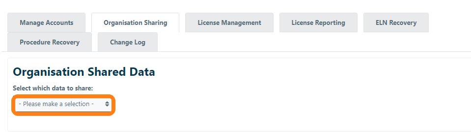 In the Organisation Admin Panel, you can also manage the sharing of storage units, equipment and experiment templates to make them available for other labs in your organisations. In this way, different labs have access to (parts of) a storage unit to store samples or to the equipment planner, to book devices or see the availability of a device. Open the organisation sharing tab in the Organisation Admin panel.
