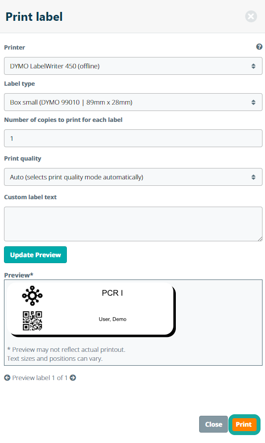 Choose one of the system template labels, or add a custom label, including a 2D barcode and click Print to print the barcoded label.