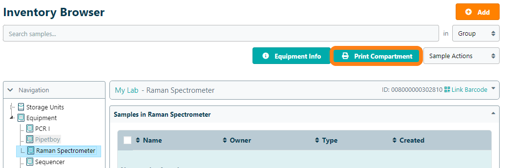 Use the Mobile App to book devices by scanning a device barcode. To print a device barcode, navigate to Inventory – Inventory Browser and select the device from the tree. Click on the Print Label option in the print compartment option. Note that this option is only available if you enabled the DYMO LabelWriter or Zebra Label Printer on your account.