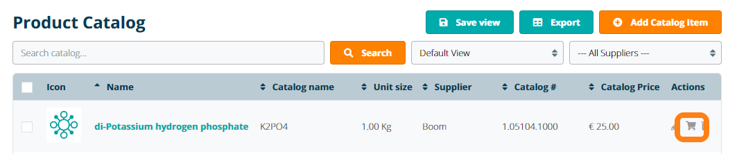 To place a new order for an item in the Product Catalog, click the Order icon under the Actions column.