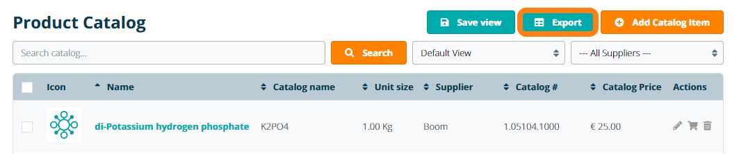 Users can export a copy of their Product Catalog as an Excel file by clicking the Export button. A partial list of catalog items can also be exported by marking the checkboxes of specific line items before initiating the export.