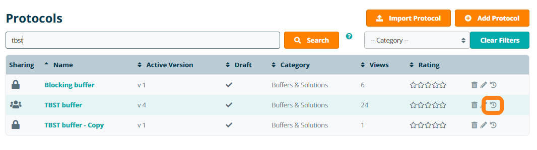 Only the most recent active version of a protocol is available as a template for experiments. If a new draft of the protocol is opened, the latest active version of the protocol will remain active and available for use to ensure that the update process does not prevent access to the protocol. Users can view the version history of a protocol by clicking the History icon inline with the protocol on the Protocol List page.