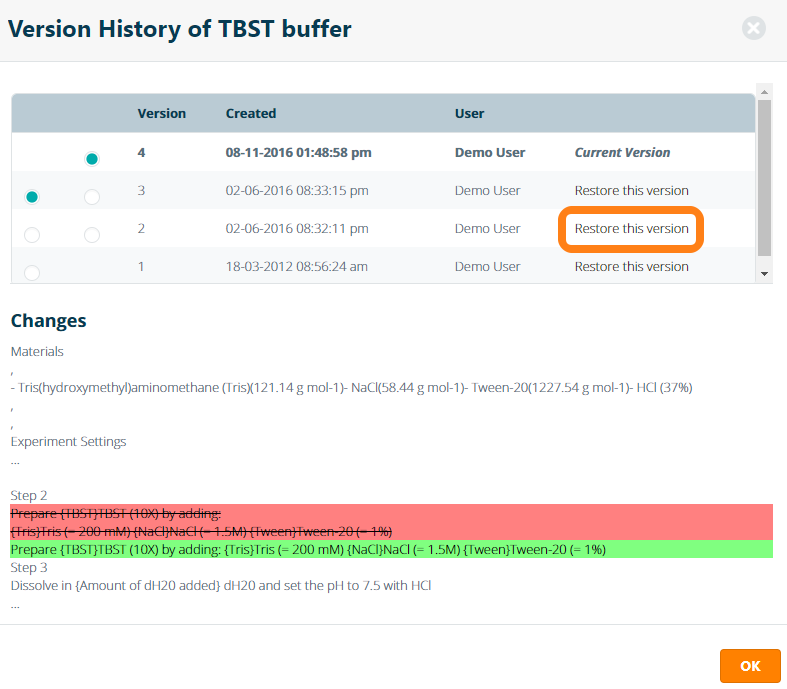 In the pop-up window, users can compare changes made between any two versions of the protocol. Additionally, they can click Restore this version to restore a previous version of the protocol as the latest active version. Note: restoring a previous protocol version is treated as the creation of a new protocol version. The previous version's content is copied and assigned its own unique version number.