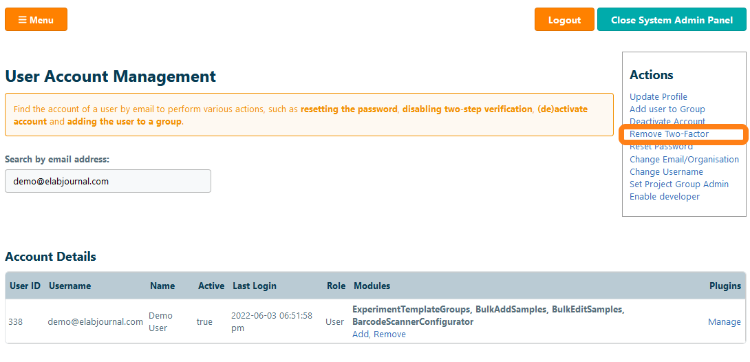 To disable two-step verification for a user, navigate to Manage Accounts in the System Admin Panel. Find the relevant account by entering the email address and click Remove Two-Factor.