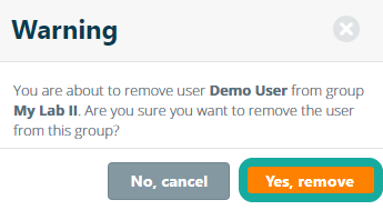 Confirm the removal of the user from the group. Note that the removal of a user may result in loss of data in case a user is removed from its active group while working in the system.