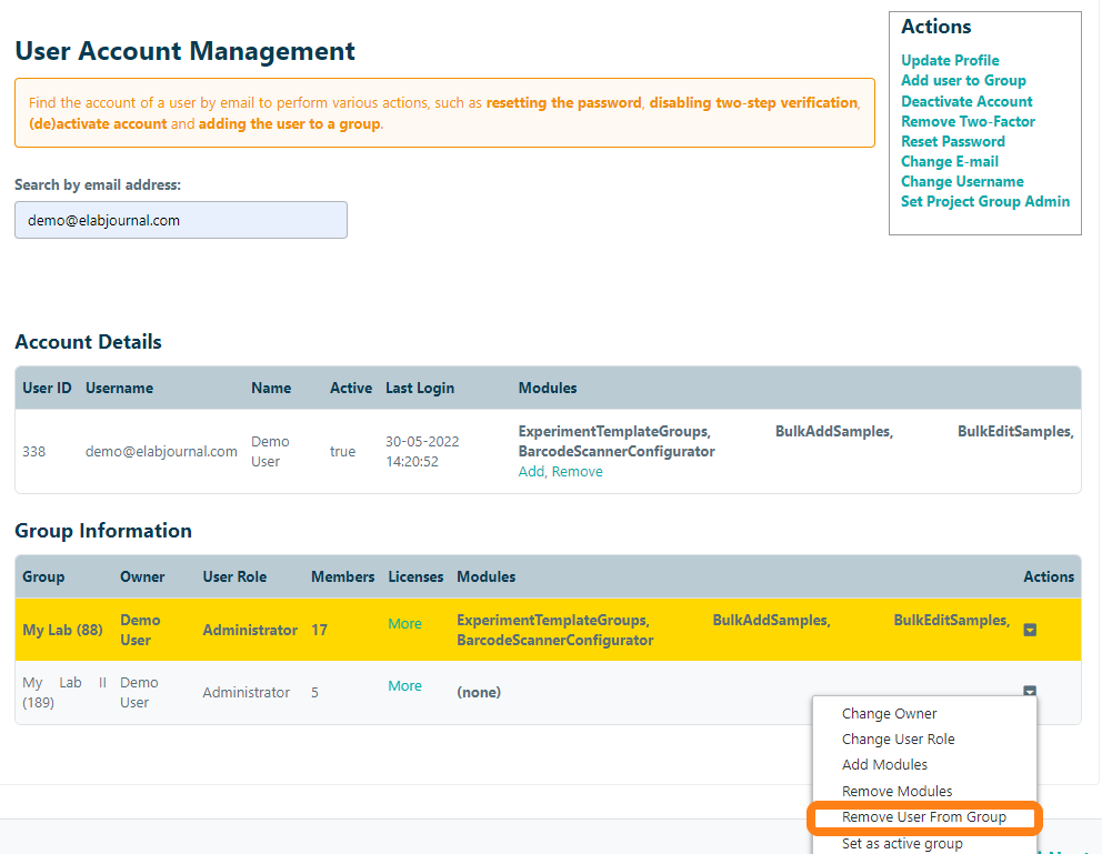 To remove a user from an existing group, navigate to Manage Accounts the Organisation Admin panel. Find the account by using the email address and open the Actions menu of the group from which the user should be removed. In the appeared sub-menu, click Remove User From Group.