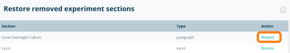 Sections that have been removed from an experiment in the ELN can be restored from the archive. Open the experiment and click Restore to access the archive.