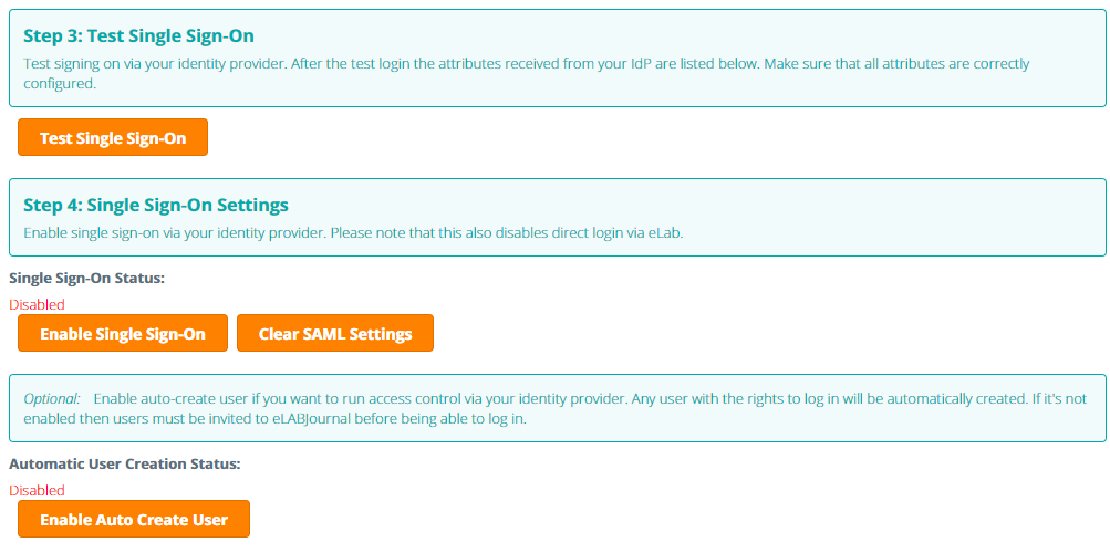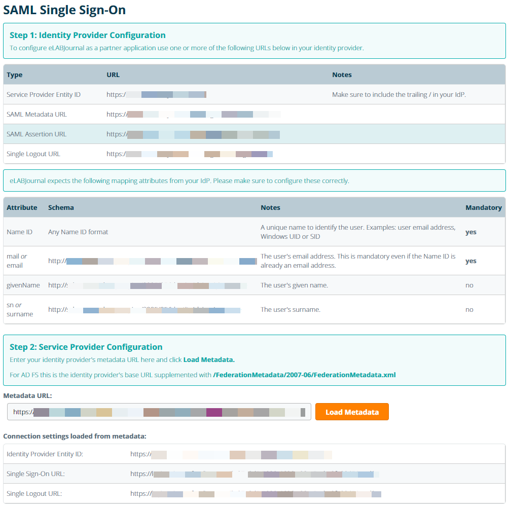 Here you can retrieve the urls for the Service Provider EntityID, the SAML metadata URL, the SAML Assertion URL and the Logout URL. Use those in your SAML provider and set-up the mapping of the attributes eLabJournal requires. In case you experience any problems or if you have any questions about setting up SAML authentication please contact us.